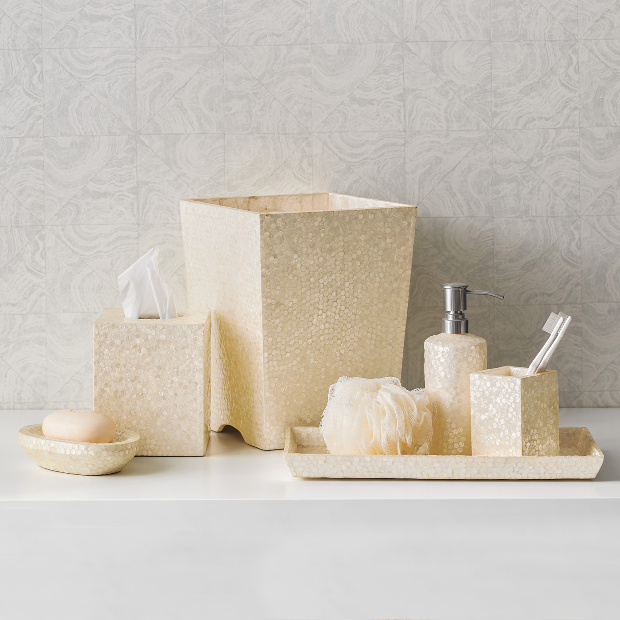 Beach Themed Bathroom Soap Dispenser - Capiz Shell Bath Accessories | Gump's - Complement to your nautical or ocean theme bathroom decor.. In a comtemporary style that is unique and decorative with it's two tone brush effect, the coast range of bathroom accessories is affordable and stylish. Sea theme | coastal bathroom soap dispenser set | beach bathroom decor. 4 piece bath accessory set including 1 lotion dispenser (soap pump), 1 toothbrush holder, 1 tumbler, 1 soap dish; Specify tumbler, tissue cover, soap dish, lotion/soap dispenser, wastebasket, or toothbrush holder. It's part of our coastal bathroom range;